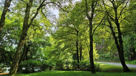 2025/06/27 今日は雨は無いと思っていたら、夕方かなり降りました。写真は雨の直前なので、緑が生き生きとしています。近くのショッピングセンターの小さな庭ですが、良いでしょ!!この茂った感じが好きです。 |