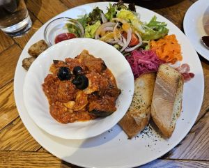 2026/01/19 土曜日「狩場の悲劇」を見た、所沢市民文化センターミューズにあるレストラン「ROCCO」で開演前にランチ。所沢航空公園の隣なので、木立の景色がとっても良い感じです。ランチメニューの「若鶏のトマト煮込みプレート」にしました。野菜が色とりどりで楽しい。 |
